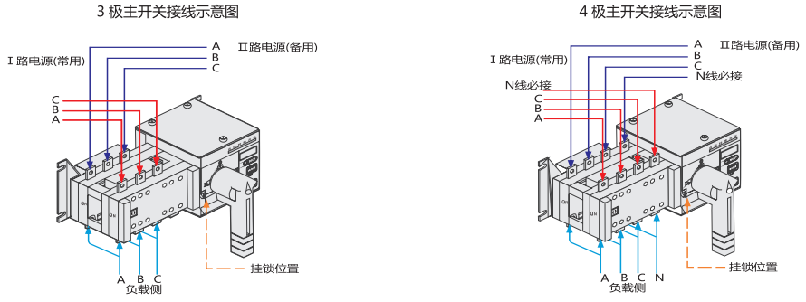 * 机械挂锁:检修专用的挂锁机构,检修时将开关打到"0"档,再拉起挂锁机构上挂锁,可防止任何意外(拉起挂锁则切断开关内部控制